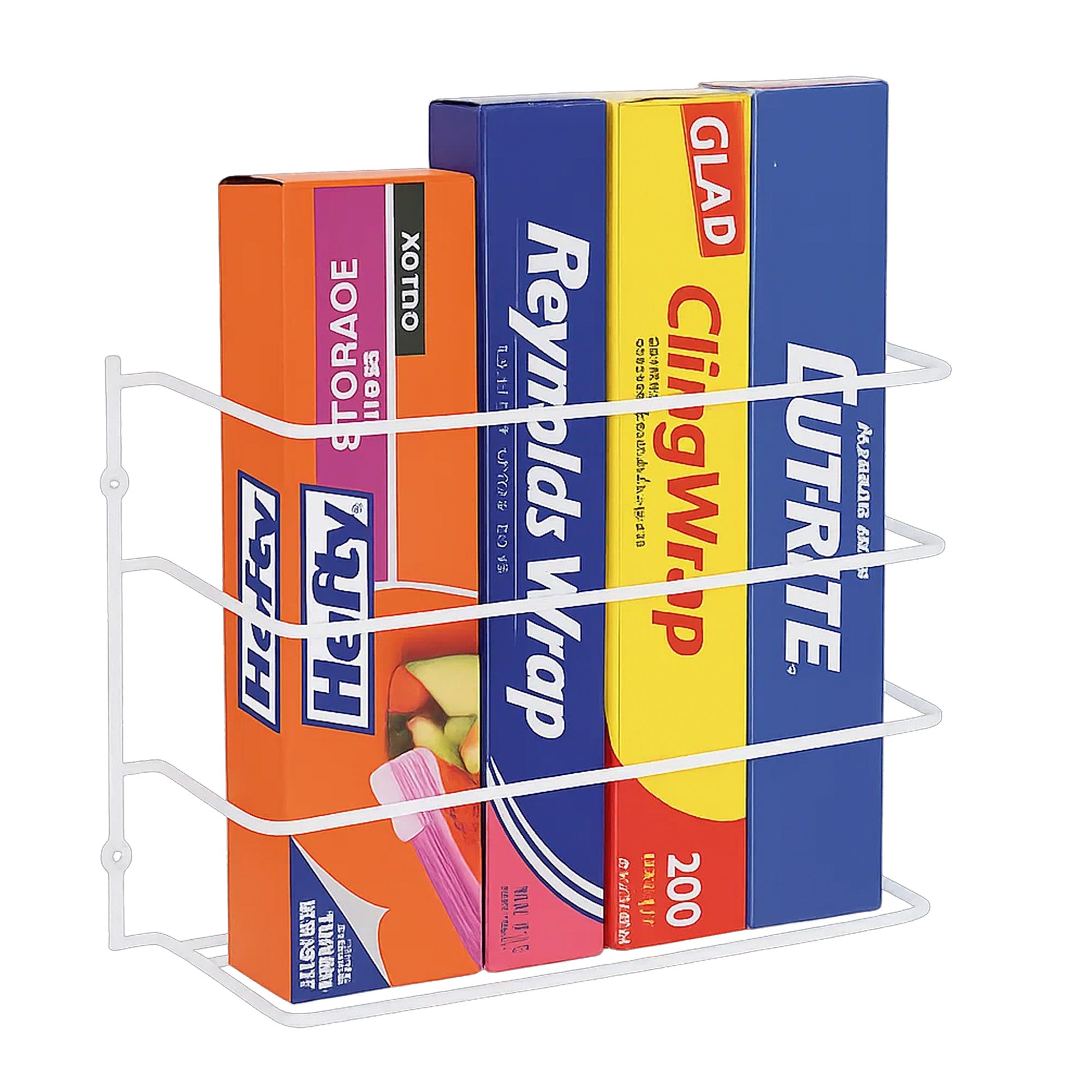 maximize your kitchen accessories storage space. These mountable shelves help you store wax paper, aluminum foil, saran wrap, zip & garbage bags, paper bags, food wraps.